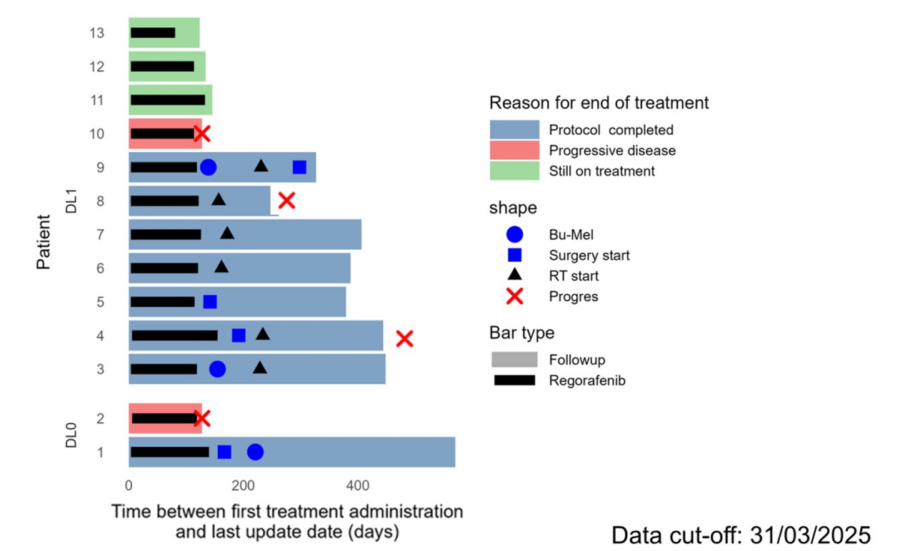 Rego-Inter-Ewing-1研究为一项国际性、多中心、Ⅰb期临床试验,旨在将口服多靶点TKI瑞戈菲尼加入到标准剂量VDC/IE方案中,应用于新诊断的多发转移尤文肉瘤人群。该研究最终将82 mg/m²/day(上限160 mg/day),d5–d25作为推荐Ⅱ期剂量,并计划在2025年第三季度启动Inter-Ewing-1试验,用于检验“在新诊断转移尤文肉瘤(包括仅肺/胸膜转移)标准治疗中加入瑞戈菲尼”的疗效与临床获益。