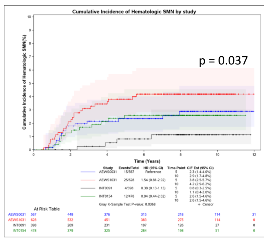 在COG/Intergroup多项III期尤文肉瘤试验的随访汇总中(n=2071,中位随访8.6年),共观察到74例第二恶性肿瘤,其中血液系统SMN占多数(56/74)。不同试验间5年血液系统SMN累计发生存在差异,AEWS1031最高(3.8%,95%CI 2.5%~5.7%,p=0.037)。多因素模型提示女性是总SMN与血液系统SMN的独立危险因素(HR分别为2.39与2.67),而实体瘤SMN风险与放疗暴露相关(HR为3.04)。