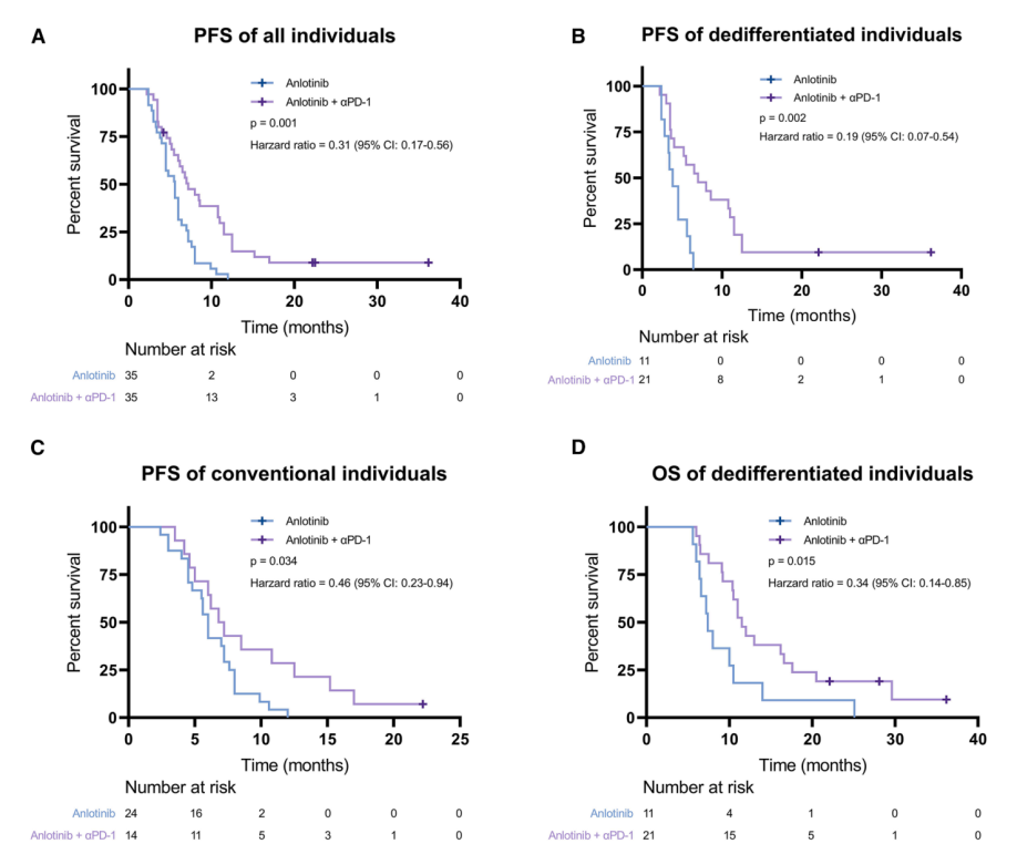 该项随机对照试验中的Arm A为:安罗替尼12 mg,d1–14,q3w;Arm B为:安罗替尼+PD-1抑制剂200 mg q3w。疗效分析表明:6个月PFS率:31.4%(A)对60.0%(B);mPFS:5.6个月对7.2个月;ORR:5.7%对 22.9%;DCR:68.6%对74.3%,其中获益最大的亚型是去分化软骨肉瘤。该研究还发现所有客观缓解(CR/PR)的患者都携带IDH1/2突变,提示IDH状态可能与免疫联合治疗获益相关。