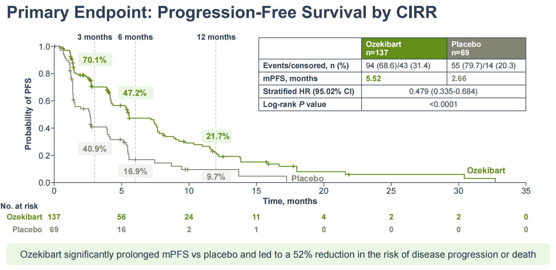 晚期、不可切除传统型软骨肉瘤系统治疗选择少、PFS期很短。研究表明,软骨肉瘤细胞系DR5高表达且对内源性凋亡耐受,一项DR5(TNFR家族,TRAIL结合后诱导凋亡)激动剂ozekibart(INBRX-109)的二期研究正在展开。该项随机对照试验表明:mPFS期:5.52个月对2.66个月(ozekibart对安慰剂);HR 0.479,p<0.0001,在晚期传统型软骨肉瘤中,ozekibart能明确改善PFS期,而且毒性谱可控,有望成为晚期传统型软骨肉瘤的首个标准治疗选择。