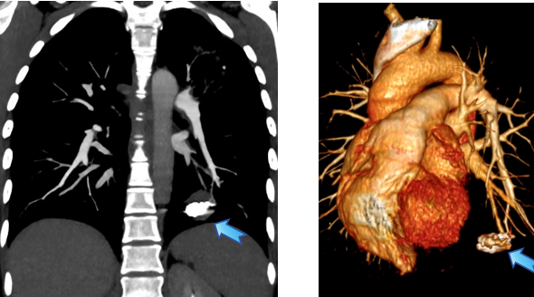 王女士很快入住瑞金医院放射介入科病房。经过肺动脉CTA检查后,答案清晰——经团队讨论判定,该病变并非典型“肺内肿块”,而是位于左肺下叶分支血管内的肺动脉动脉瘤。该病变很少见,与咯血高度相关,一旦破裂可导致大出血,性命攸关。