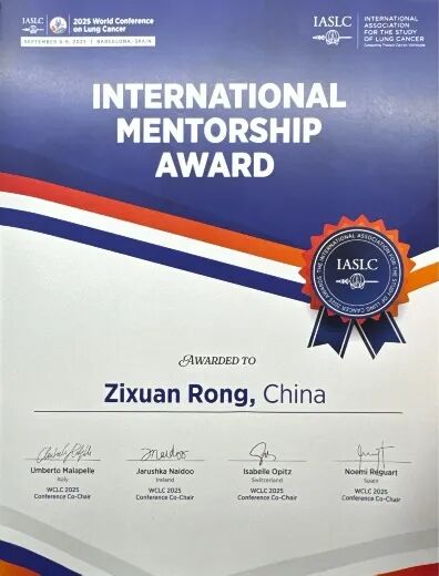 放疗科肺癌研究团队长期贯彻培养支持优秀青年人才为主体进行大会投稿与报告的理念,本次大会团队包括白雪副研究员,张艳培博士后、李上标博士后,魏微博士、容子轩八年制研究生以及林乐怡八年制研究生等多名青年医师与学生受邀汇报并获国际学术平台认可与荣誉奖项,其中李上标获发展中国家教育奖(全球仅10人), 张艳培、容子轩获得国际导师奖(全球仅8人)并受IASLC邀请赴法国和意大利进行学术访问。优秀青年医师及学生的不断发展,既是科室人才培养的有力见证,同时也为学科的长期高质量发展注入了源源不断的动力。