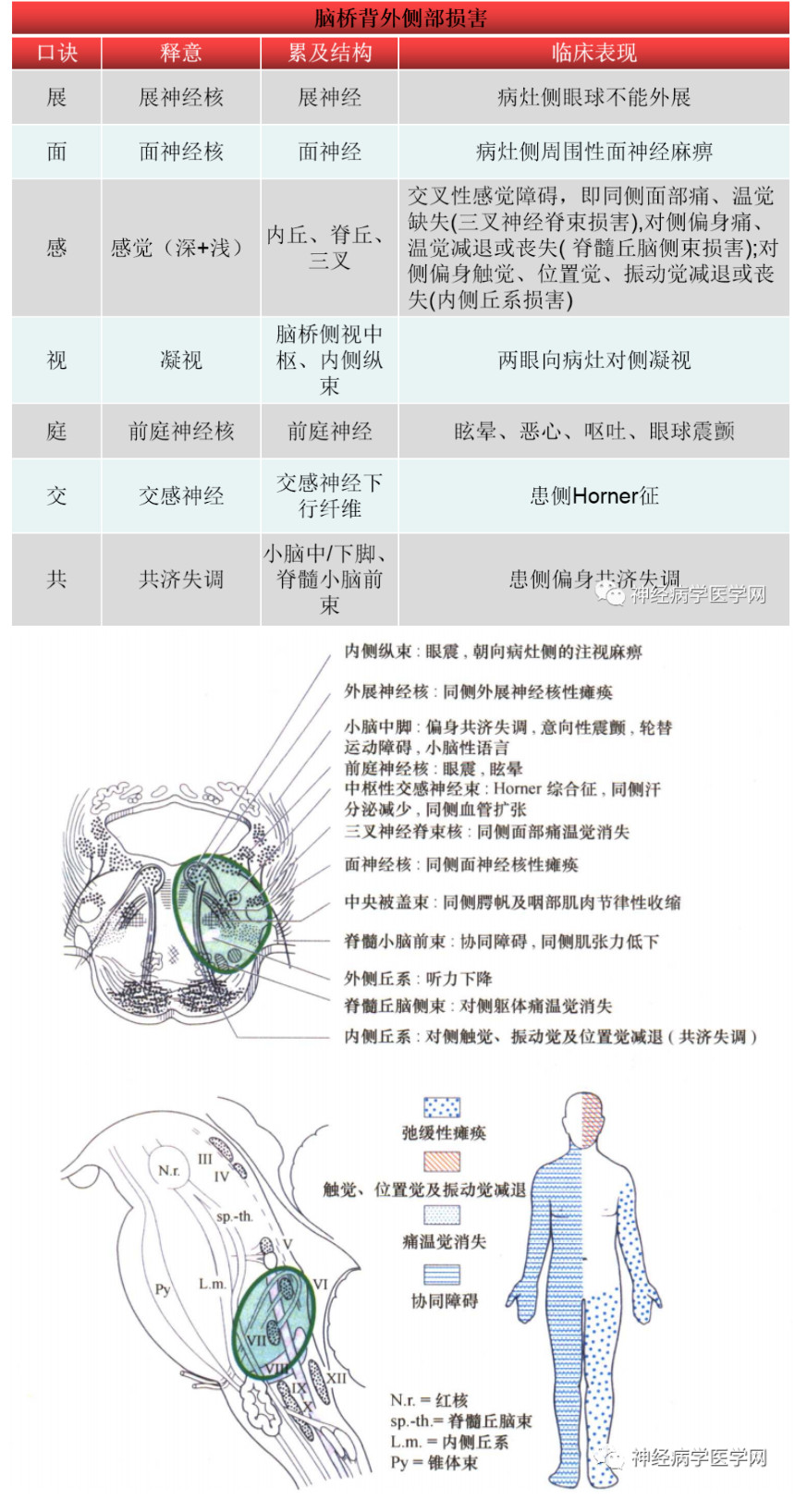 说明:眼:动眼神经核,锥:椎体束,红:红核,黑:黑质,感:感觉(脊髓丘脑束、内侧丘系、三叉神经),展:展神经核,面:面神经核,视:侧视中枢或内侧纵束,庭:前庭神经核,交:交感神经(Horner征),共:共济失调,舌:舌下神经核
