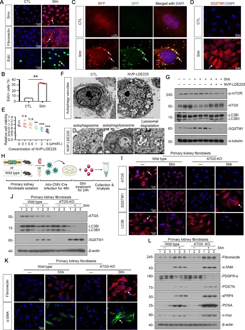 随后,研究人员通过分离原代成纤维细胞以及NRK-49F成纤维细胞系揭示:Shh刺激可上调Smo及纤连蛋白表达、促进细胞增殖,同时抑制自噬流并诱导SQSTM1积累;而使用Smo特异性拮抗剂NVP-LDE225或自噬诱导剂雷帕霉素则可逆转上述效应,抑制肌成纤维细胞活化。在ATG5敲除的成纤维细胞中,Shh对自噬的抑制作用及对肌成纤维细胞活化的促进作用进一步增强,而过表达ATG5则抵抗Shh的效应。这些结果表明,Shh/Smo信号通过抑制自噬驱动成纤维细胞向肌成纤维细胞转化,从而参与肾脏纤维化进程。(图2)