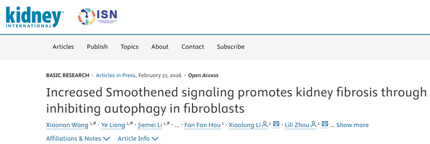 基于以上,来自南方医科大学南方医院肾内科的周丽丽/李晓龙团队于2026年2月在Kidney International杂志上发表了题为“Increased Smoothened signaling promotes kidney fibrosis through inhibiting autophagy in fibroblasts”的文章,该研究揭示肾脏成纤维细胞的Smoothened(Smo)信号在抑制细胞自噬、驱动CKD肾脏纤维化进程中的关键作用。该研究不仅为理解肾脏纤维化的演进机制提供了全新视角,也为慢性肾脏病的临床干预开辟了潜在的新靶点。