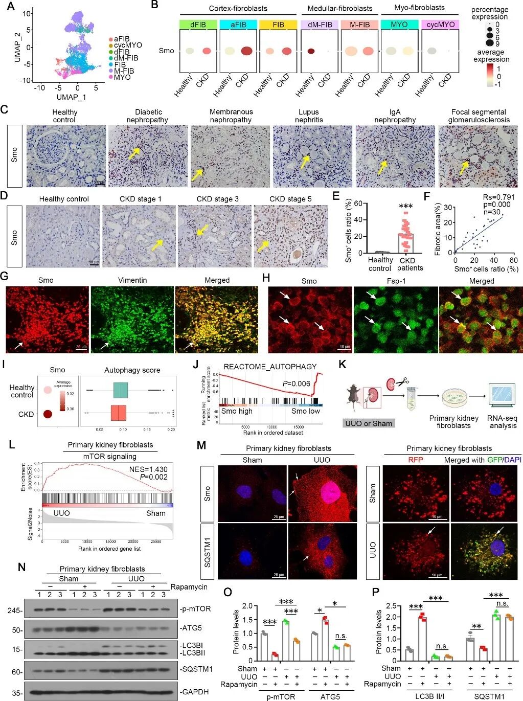 首先,研究人员通过分析人类肾脏snRNA-seq数据,将成纤维细胞划分为七个功能亚群,并发现:与健康对照组相比,在CKD样本中,Smo在皮质成纤维细胞多个亚群[FIB、dFIB(早期肌成纤维细胞)和aFIB(肌成纤维细胞潜在祖细胞)]中表达显著升高,在肌成纤维细胞(MYO)和髓质纤维细胞(M-FIB)中也有所增加,而在基质和ECM评分较低的髓质退化纤维细胞亚群(dM-FIB)中则表达下降。进一步在多种CKD模型及原代细胞中证实,Smo高表达的成纤维细胞呈现肌成纤维细胞活化表型,同时伴随自噬流受阻及自噬诱导反应性丧失。这些结果表明,Smo的高表达与成纤维细胞活化及细胞外基质产生密切相关,提示其在肾脏纤维化进程中可能发挥关键作用。(图1)