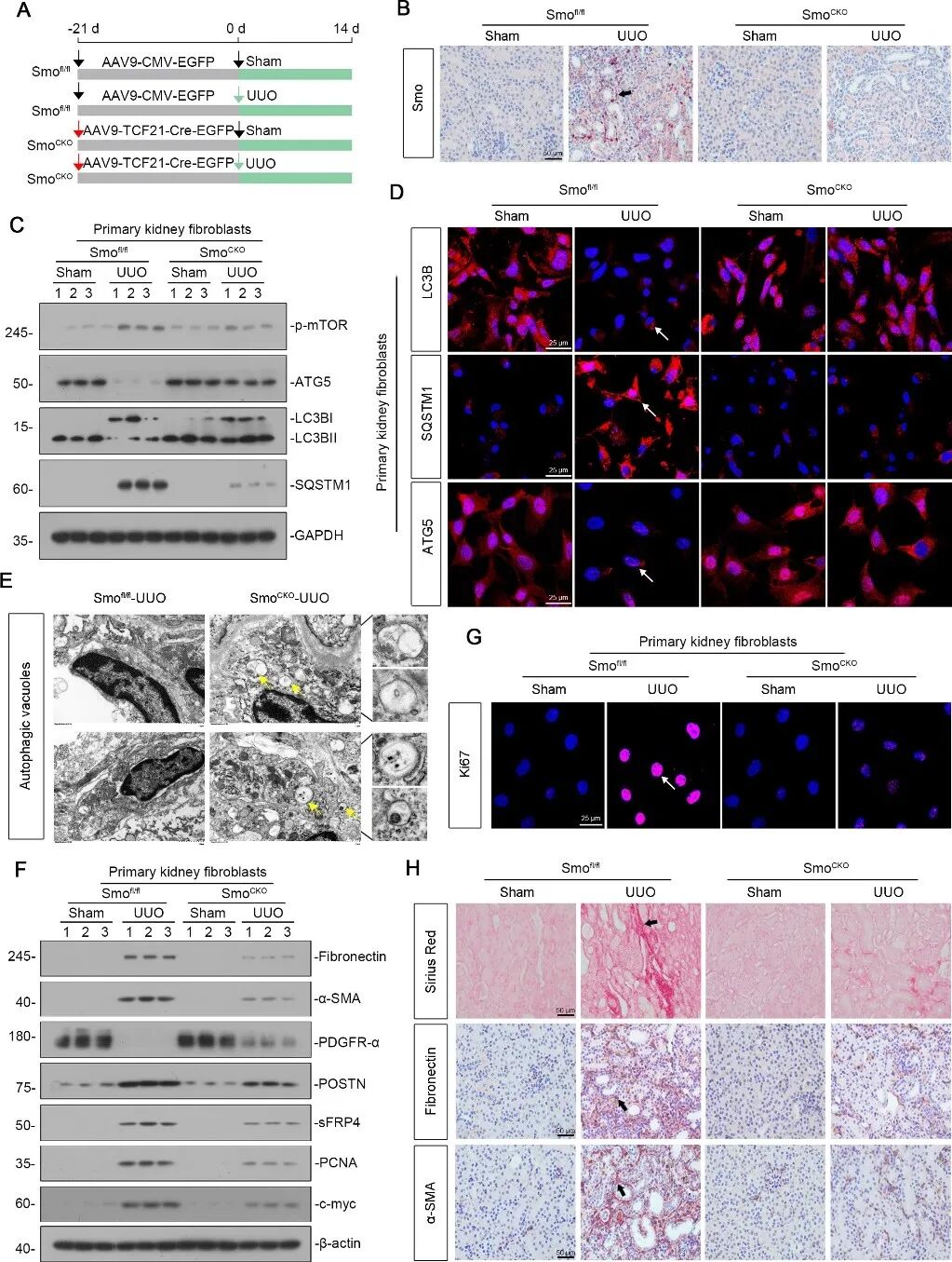 接下来,通过构建成纤维细胞特异性Smo敲除小鼠(SmoCKO)并实施UUO手术,研究人员发现:与对照组相比,SmoCKO小鼠来源的原代肾成纤维细胞中p-mTOR和SQSTM1表达下调,ATG5和LC3BII形成增加,自噬空泡增多,自噬能力得以恢复;同时,这些细胞的肌成纤维细胞活化标志物表达降低,增殖能力减弱,肾间质基质沉积和纤维化病变明显减轻。这些结果表明,成纤维细胞中的Smo通过抑制自噬促进肌成纤维细胞活化,从而驱动肾脏纤维化进展。(图3)