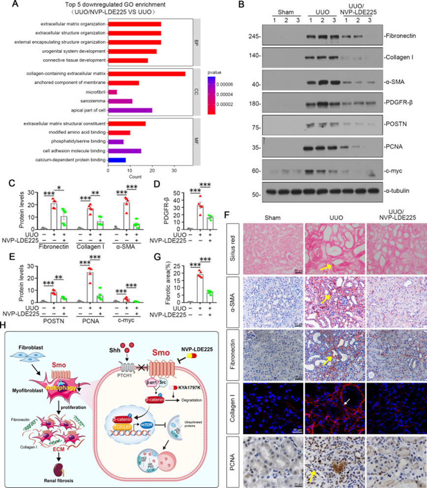 最后,通过在已建立的UUO小鼠模型中给予Smo拮抗剂NVP-LDE225治疗,研究人员发现:NVP-LDE225可有效抑制肾间质成纤维细胞中Smo及活性β-catenin的表达,降低纤维细胞增殖;同时,该处理显著增强了成纤维细胞的自噬能力,表现为p-mTOR和SQSTM1表达下调、LC3B斑点增多、自噬空泡增加。RNA-seq及GSEA分析进一步证实,NVP-LDE225处理抑制了Hedgehog信号及非经典Wnt通路。这些结果表明,靶向Smo可通过抑制β-catenin、恢复自噬功能来阻断肌成纤维细胞活化,在已建立的纤维化模型中仍具有治疗潜力。(图7)