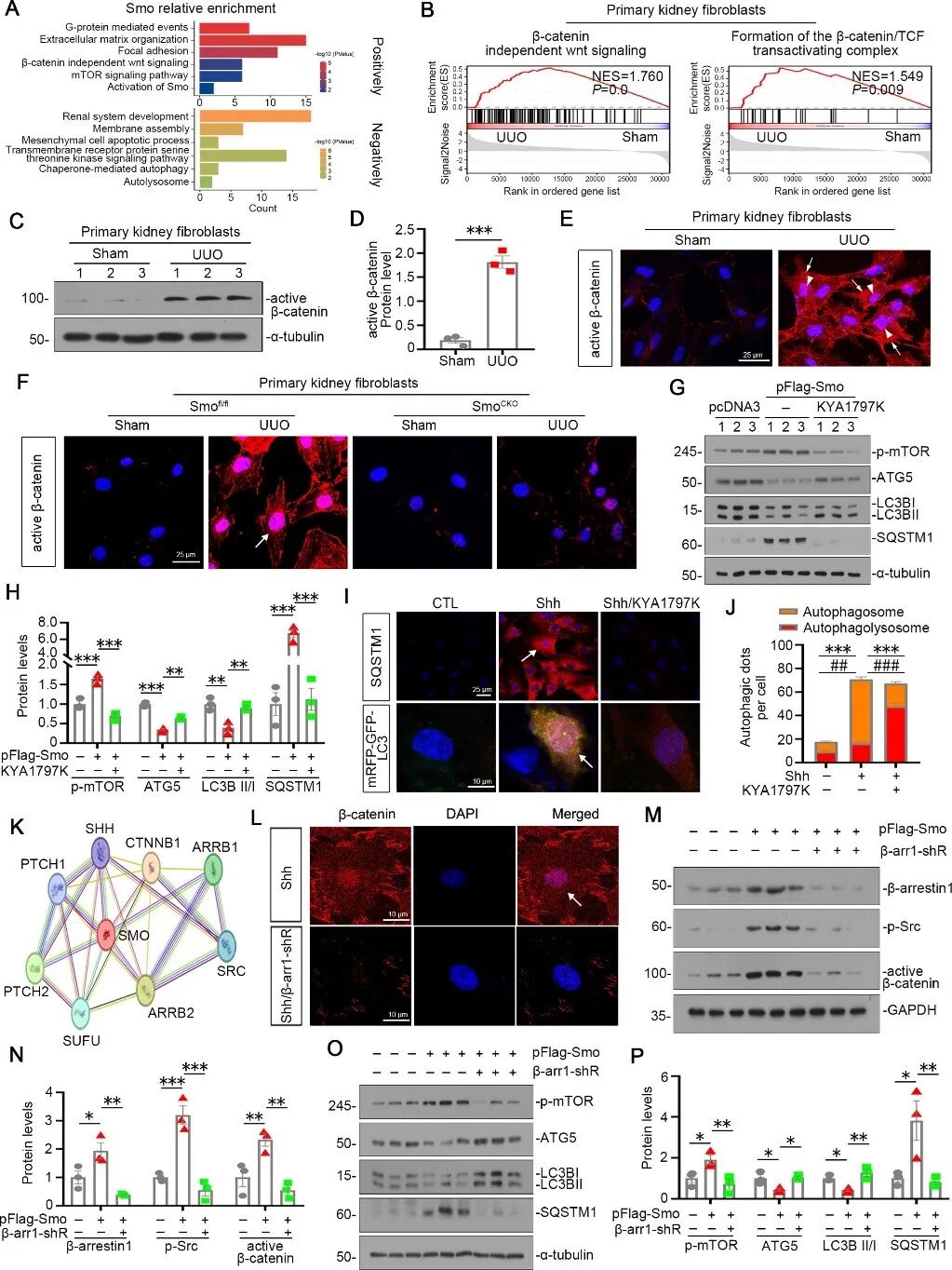 接下来,研究人员通过整合人类肾脏snRNA-seq数据分析及原代成纤维细胞GSEA验证,发现Smo正向调控细胞外基质形成、非经典Wnt信号及mTOR通路,同时抑制自噬;进一步机制研究表明,Smo通过β-arrestin 1/Src复合物促进β-catenin活化入核,而使用β-catenin降解剂KYA1797K或干扰β-arrestin 1可抑制p-mTOR、恢复自噬流并阻抑肌成纤维细胞活化。这些结果表明,Smo主要通过β-arrestin 1/Src/β-catenin调控成纤维细胞自噬与活化。(图4)