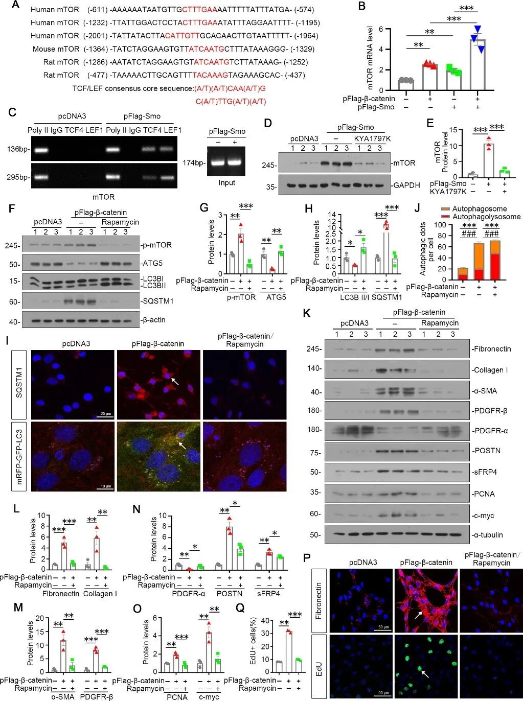 随后,生信预测与实验验证显示,β-catenin核效应分子TCF/LEF可直接结合 mTOR 启动子,Smo与β-catenin过表达可协同上调mTOR转录及蛋白磷酸化,而β-catenin降解剂KYA1797K可阻断这一过程。功能实验表明,β-catenin过表达通过激活mTOR抑制自噬流,雷帕霉素可逆转该效应并减轻肌成纤维细胞活化与基质沉积。上述结果揭示 Smo/β-catenin/TCF-LEF轴通过转录上调mTOR、抑制成纤维细胞自噬,进而驱动肾脏纤维化的新机制。(图5)