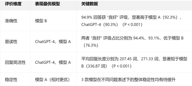 本研究初步表明,这 3 款大语言模型在准确回答胃肠病学问题方面具备一定潜力,但各有侧重——模型 B 擅长准确性,ChatGPT-4 与模型 A 擅长可读性与简洁性。未来须进一步优化模型的“语义理解能力” 与 “应答稳定性”,才能推动其在临床实践中可靠应用。