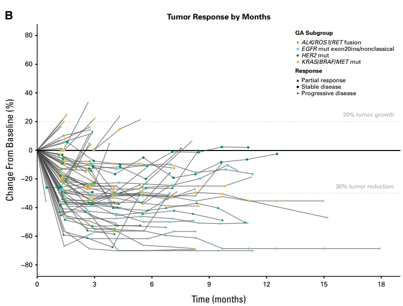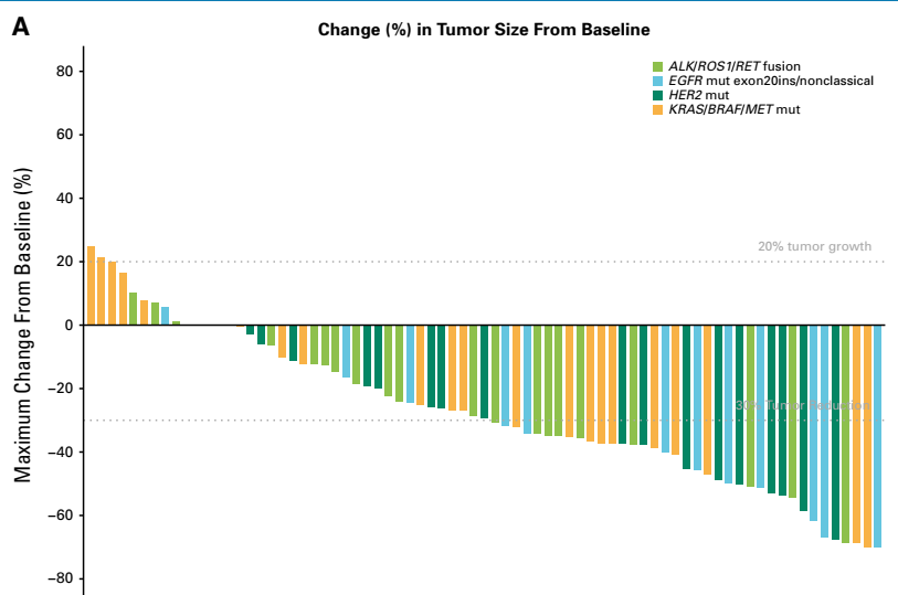 在83例患者中,共包含14例EGFR非经典突变、19例HER2突变、26例KRAS/BRAF/MET突变和24例ALK/ROS1/RET/NTRK基因融合患者。