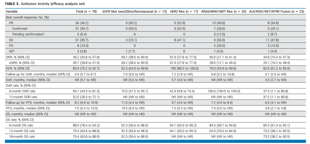 该研究共纳入83例经过标准治疗失败的驱动基因阳性患者(不包含EGFR 19del 和21L858R突变),所有入组患者均接受iza-bren 2.5mg/kg D1D8 Q3W的方案治疗。其中,83例患者进行安全性分析,78例患者纳入疗效分析。