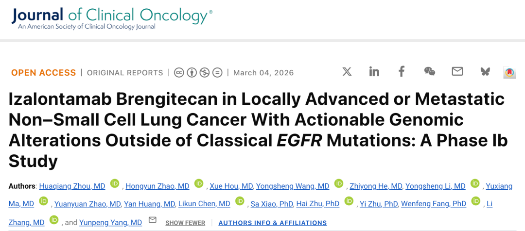 近日,由中山大学肿瘤防治中心张力、杨云鹏团队在国际顶级医学期刊《临床肿瘤学》(JCO)发表了双特异性抗体偶联药物(ADC)iza-bren在携带经典EGFR突变以外驱动基因变异的NSCLC患者中的Ib期研究结果。该研究结果显示:iza-bren后线治疗除驱动基因阳性人群(不包含EGFR 19del 和21L858R突变),整体客观缓解率(ORR)达到46.2%,中位无进展生存期(mPFS)7个月。在EGFR 20号外显子插入突变(exon20ins)及其他非经典突变人群中,客观缓解率高达69.2%,中位无进展生存期达10.5个月,为这类难治性患者探索了新的治疗方案。