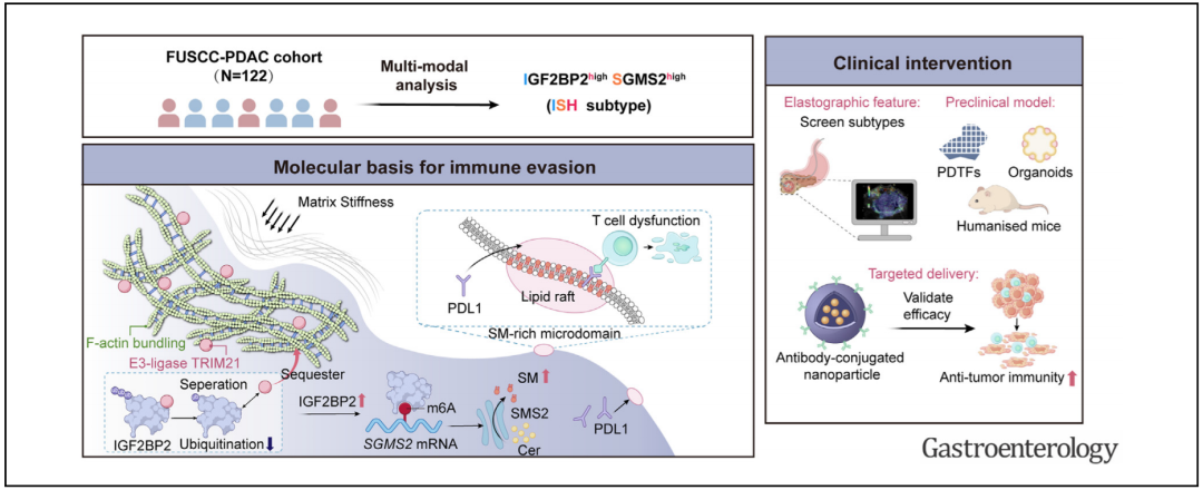 综合多组学分析显示,m6A阅读蛋白IGF2BP2是PDAC预后不良的关键分子,其高表达与效应免疫细胞浸润减少及纤维化TME密切相关。机制上,PDAC中较高的基质硬度可稳定IGF2BP2蛋白,进而上调鞘磷脂合成酶SGMS2,促进鞘磷脂合成。该通路有助于PD-L1在膜脂筏上的定位,从而增强肿瘤免疫逃逸能力。基于PDAC的弹性成像特征,可实现针对IGF2BP2/SGMS2高表达患者的无创筛查。干预鞘磷脂合成可显著提升抗肿瘤免疫应答,并在人源化小鼠模型中有效抑制PDAC生长,凸显该通路作为PDAC免疫治疗靶点的潜力。