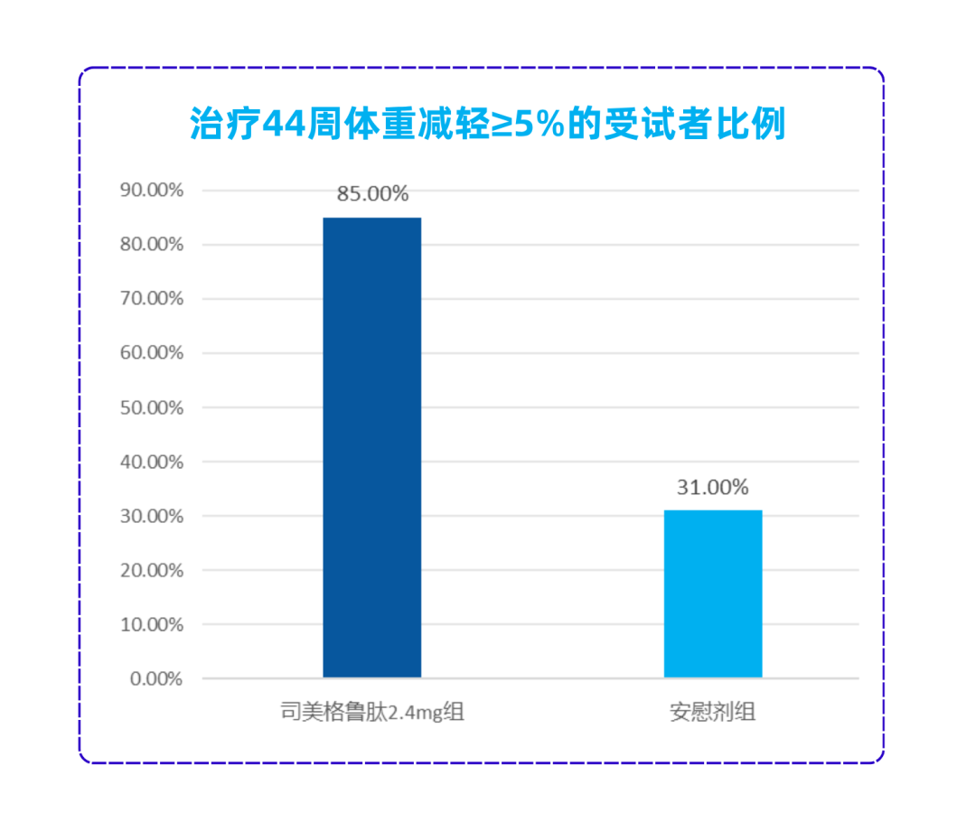 在第44周,司美格鲁肽2.4mg组减重≥10%的比例为63%,安慰剂组为10%;减重≥15%的比例司美格鲁肽组为34%,安慰剂组为6%。