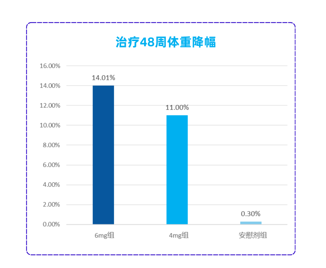 玛仕度肽4mg组和安慰剂组受试者体重较基线的平均百分比变化分别为-11.00%和0.30%。