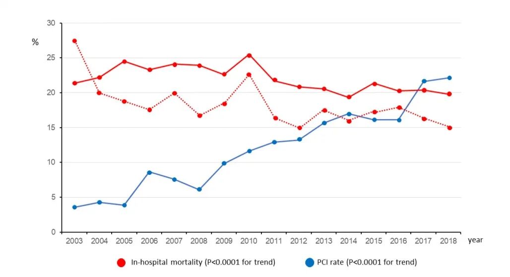 研究调查了意大利伦巴第地区2003—2018年健康数据库,共15954例≥90岁的AMI住院患者。发现总的PCI率为12%,尽管占比较低,但呈显著上升趋势,从2003年的4%升至2018年的22%。