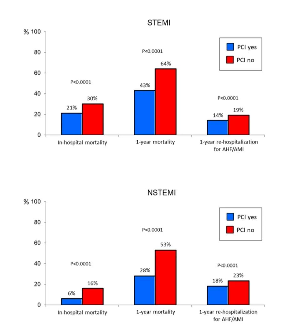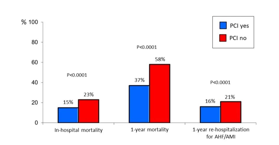 接受PCI者的院内死亡率更低(15% 对 23%),一年死亡率显著降低(37% 对 58%),再住院率也更低(16% 对 21%)。