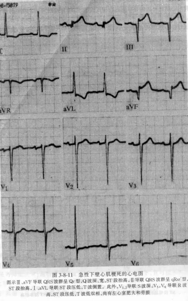 心电图:ST段弓背抬高与T波形成单向曲线、病理性Q波或呈QS形、T波由直立转为倒置并逐渐加深。心肌坏死、损伤、缺血的心电图特征在此期可同时存在。