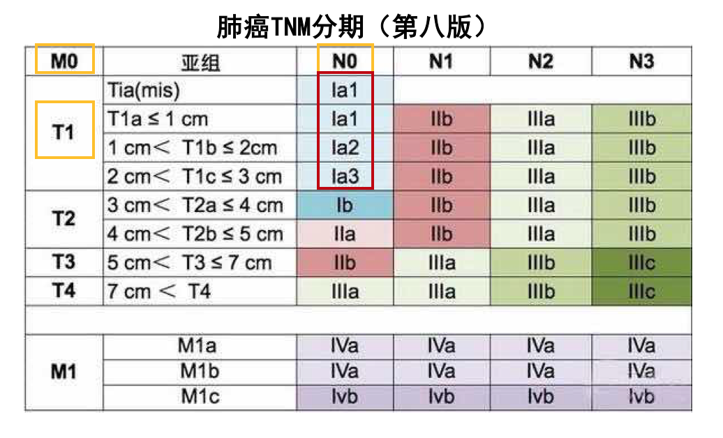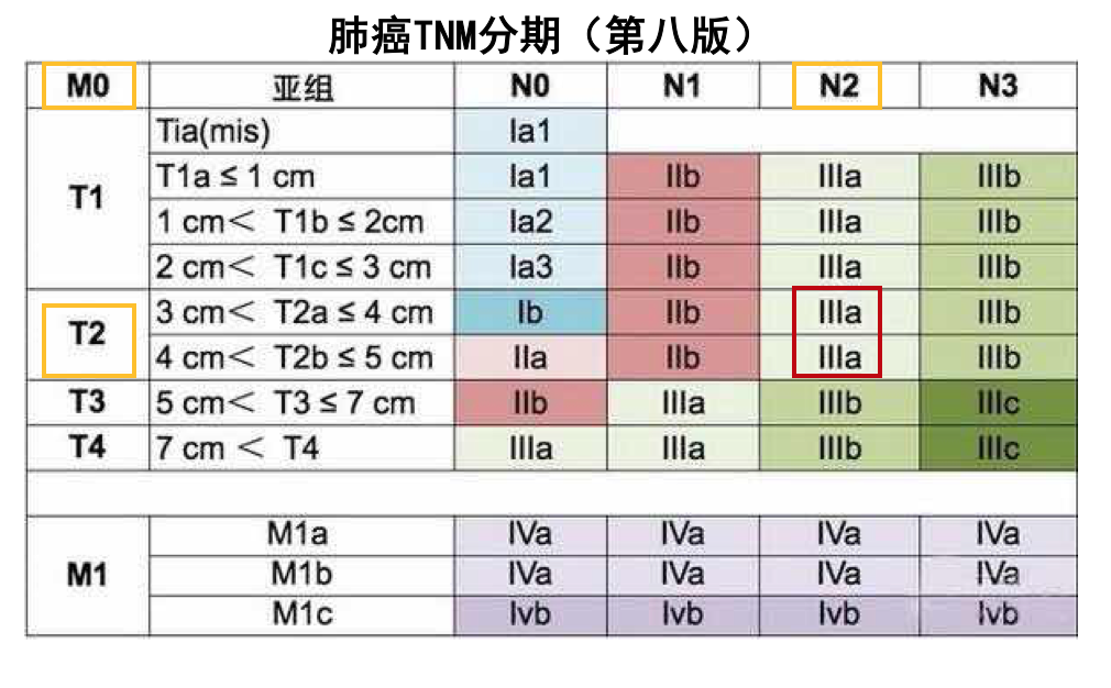 例如T1N0M0,对照上述的分期表可以知道是IA期;而如果是T2N2M0,那就是IIIa期。医生会根据肿瘤分期可以制定出相应的治疗策略。