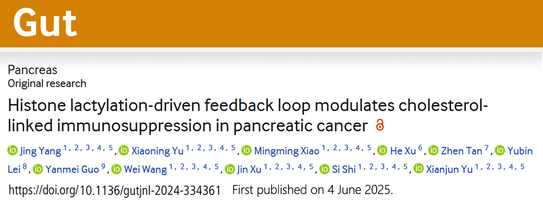 2025 年 6 月 4 日 (当地时间),复旦大学附属肿瘤医院虞先濬、施思团队于Gut期刊发表题为「Histone lactylation- driven feedback loop modulates cholesterol- linked immunosuppression in pancreatic cancer」的论文。该研究成果表明,细胞「代谢废物」乳酸可以调控胰腺癌基因表达与蛋白质功能,在胰腺癌的肿瘤微环境中发挥重要作用,进而首次系统阐明组蛋白乳酸化修饰 (H3K18la) 通过驱动乙酰转移酶 2(ACAT2) 表达,构建了「乳酸代谢-表观遗传-胆固醇免疫抑制轴」的全新机制,为破解胰腺癌的免疫治疗「密码」提供了全新策略。