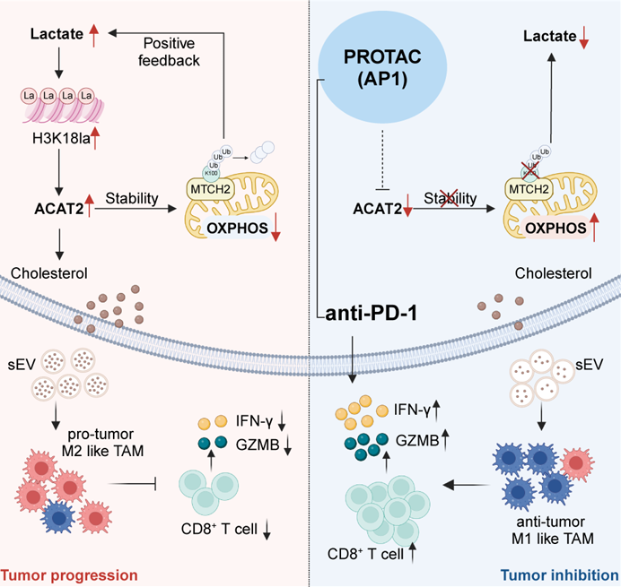 通过乳酸化修饰组学分析,发现组蛋白 H3 第 18 位赖氨酸乳酸化修饰是最显著上调,且与不良预后相关的组蛋白乳酸化修饰。同时,乳酸驱动的组蛋白 H3K18la 激活乙酰转移酶 ACAT2 的转录,诱导胰腺癌细胞内乳酸水平进一步上调。此外,研究还发现,胰腺癌细胞内 ACAT2 的过度表达诱导肿瘤相关巨噬细胞 (TAMs) 向免疫抑制性的 M2 型极化,M2 型 TAMs 进而抑制 CD8⁺ T 细胞功能,最终形成「免疫荒漠」微环境,导致免疫治疗效果不佳。以上结果表明,靶向降解 ACAT2 或能实现瓦解免疫抑制的精准爆破。