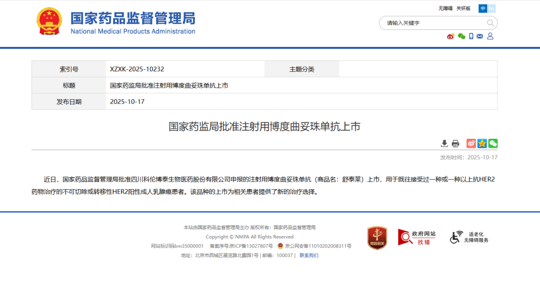 2025年10月17日,我国自主研发的新型HER2 ADC博度曲妥珠单抗正式获得中国国家药品监督管理局(NMPA)批准上市,用于既往接受过一种或一种以上抗HER2药物治疗的不可切除或转移性HER2阳性成人乳腺癌患者。