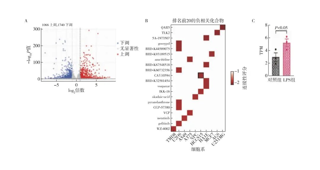 LPS:脂多糖;CMap:连通性图谱;TMD8:弥漫性大B细胞淋巴瘤;U2OS:骨肉瘤;A549:肺腺癌;A375:黑色素瘤;NPC:鼻咽癌;HCC515:非小细胞肺癌;HA1E:永生化肾上皮细胞;MCF7:乳腺癌;AGS:胃腺癌;U251MG:胶质母细胞瘤;TPM:每百万转录本;A:LPS 刺激的THP-1细胞与对照组差异基因的火山图;横坐标表示基因表达变化的log2倍数,纵坐标表示差异显著性的-log10转换后的P值;B: 横轴表示不同细胞系,纵轴为候选化合物,颜色深浅代表连接性评分的负值强度,负值越低表示与LPS诱导转录组改变的反向相关性越强,带有黑色边框的方块标记 CAY10594;C: 对照组与 LPS 处理组通过 RNA-seq 检测的 THP-1 细胞中PLD2的表达水平(n=3)