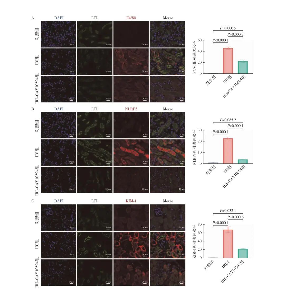 IRI:缺血再灌注损伤;NLRP3:NOD样受体家族pyrin结构域含3型炎症小体;KIM-1:肾损伤分子1;IRI模型小鼠肾组织的代表性免疫荧光图像及荧光定量分析;切片分别用 DAPI(蓝色)、LTL(绿色)、F4/80(A,红色)、NLRP3(B,红色)及 KIM-1(C,红色)染色