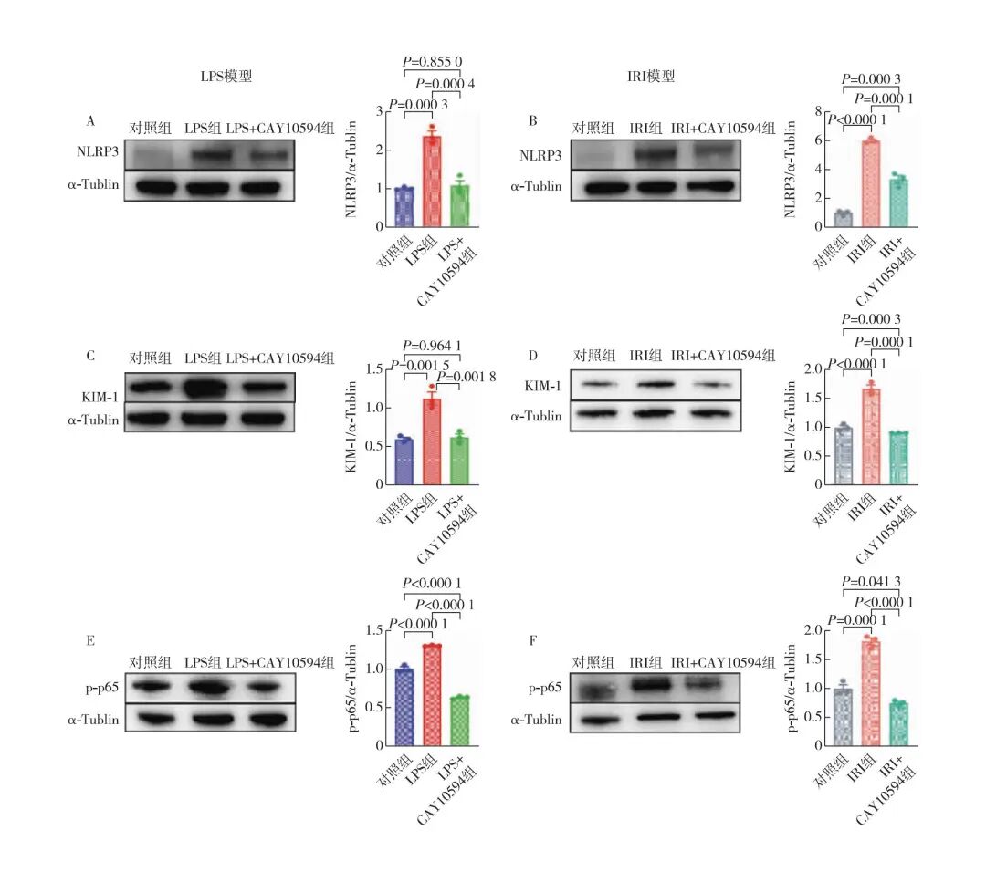 图6 CAY10594对LPS与IRI模型小鼠肾组织NF-κB信号及肾小管损伤标志物的影响