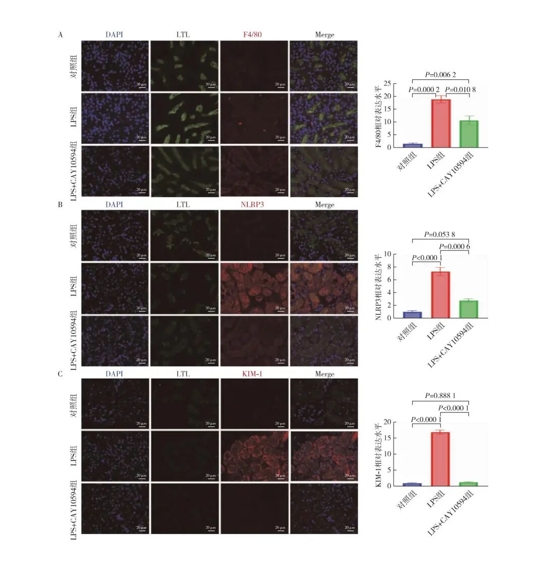 LPS:脂多糖;NLRP3:NOD样受体家族pyrin结构域含3型炎症小体;KIM-1:肾损伤分子1;LPS模型小鼠肾组织的代表性免疫荧光图像及荧光定量分析;切片分别用 DAPI(蓝色)、LTL(绿色)、F4/80(A,红色)、NLRP3(B,红色)及 KIM-1(C,红色)染色