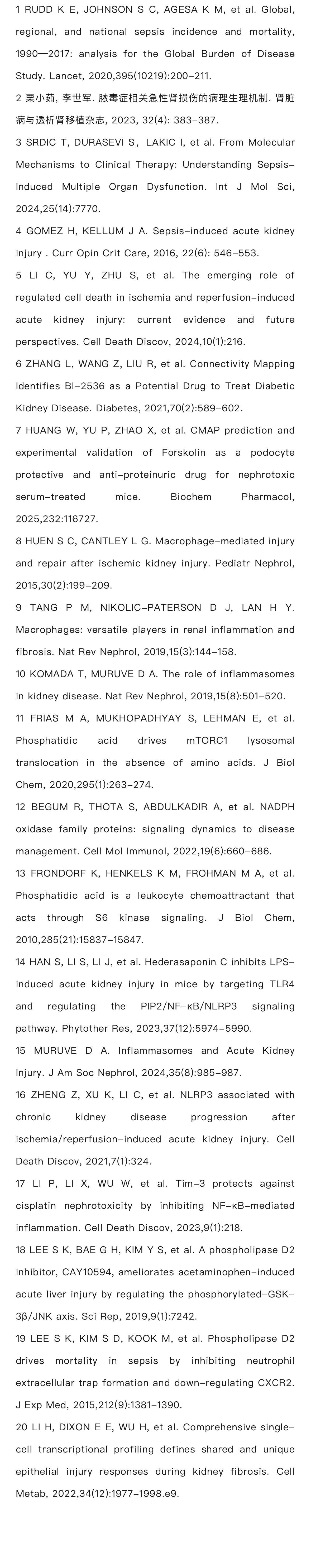 【引用本文】古晓燕、卢颖辉、南迪、龚德华. 磷脂酶 D2 抑制剂 CAY10594 对急性肾损伤的保护作用及其机制[J]. 肾脏病与透析肾移植杂志, 2025, 34(6): 532-540.
