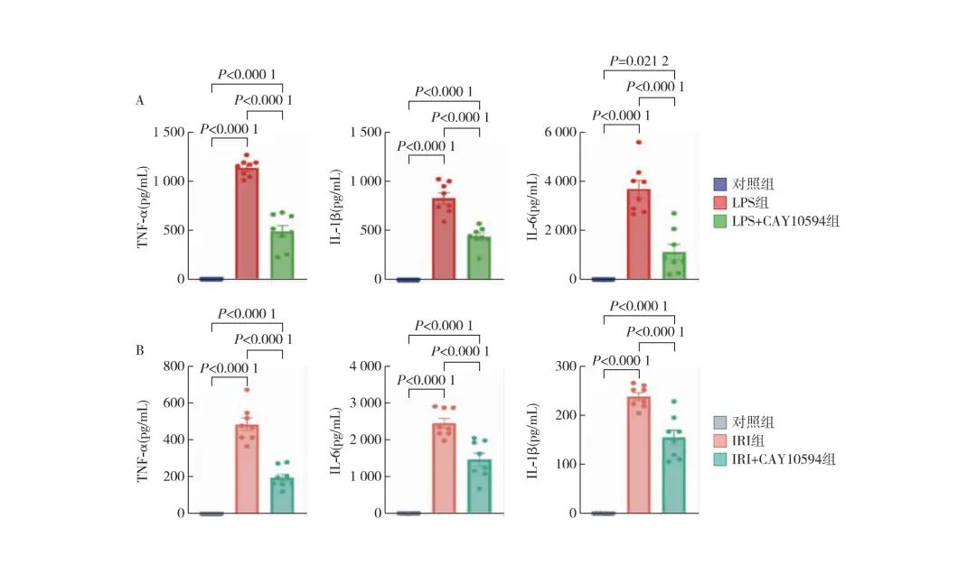 LPS:脂多糖;IRI:缺血再灌注损伤;TNF-α:肿瘤坏死因子α;IL:白细胞介素;A:C57BL/6小鼠单次腹腔注射LPS或CAY10594,6 h后检测血清中TNF-α、IL-6和IL-1β水平;B:在IRI模型中,小鼠腹腔注射CAY10594,再灌注24 h后检测血清TNF-α、IL-6和IL-1β水平(n=8)