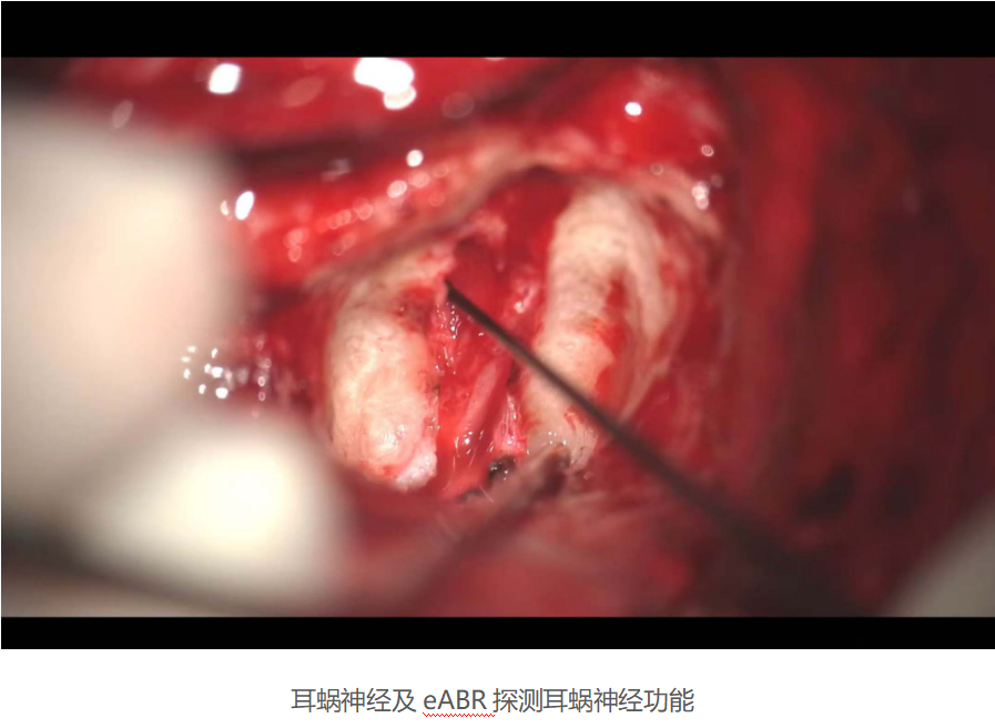 手术在严密的神经监测下进行。团队在充分暴露内听道后,小心分离、切除肿瘤组织,同时保留了面神经与耳蜗神经的结构完整。通过术中电刺激听觉脑干反应(eABR)等方法,进一步对耳蜗神经的功能完整性进行了评估。