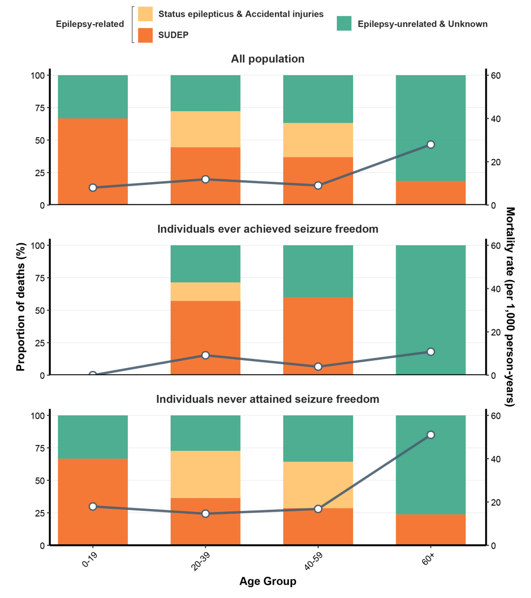 对于死亡病例,研究团队结合死亡证明及结构化死因判断问卷信息,由多学科专家小组进行死因判定,并依据规范标准对SUDEP进行分类,从而提高了死因判断的准确性与一致性。统计分析中,研究计算了死亡率、标准化死亡比(SMR)和死因构成比,并通过回归模型评估随访期间曾达到1年无发作与全因死亡、癫痫相关死亡及SUDEP死亡风险的关联。