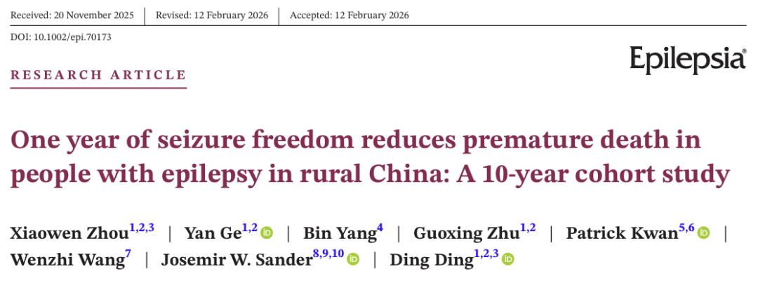近日,复旦大学附属华山医院神经内科葛炎主治医师、丁玎教授团队联合国内外专家,在国际癫痫期刊Epilepsia发表研究论文“One year of seizure freedom reduces premature death in people with epilepsy in rural China: A 10-year cohort study”。该研究基于中国农村癫痫人群流行病学前瞻性队列10年随访数据,评估了癫痫病程中达到连续1年无发作的临床诊疗目标与全因死亡、癫痫相关死亡及癫痫性猝死(SUDEP)风险之间的关联。