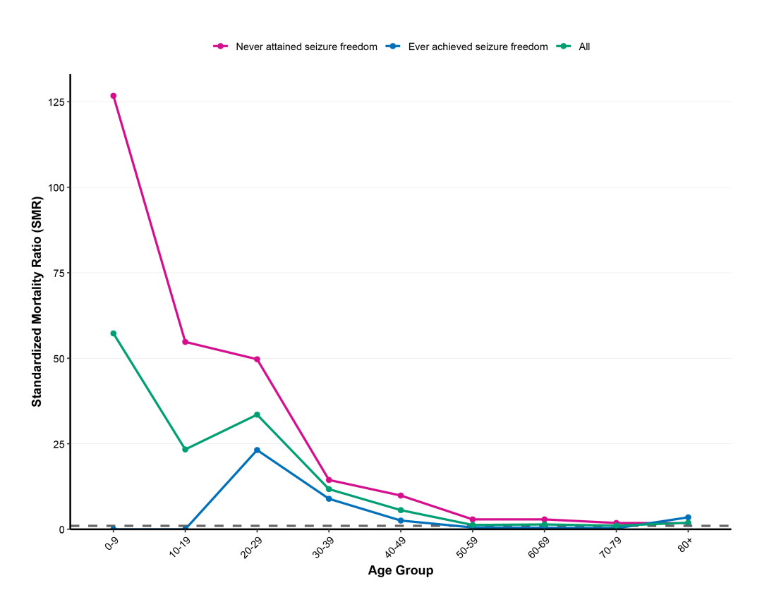 在610名纳入受试者中,10年随访期间约一半参与者曾达到连续1年无发作。全因死亡率为13.5/1000人·年,年龄和性别校正后的SMR为2.4,提示该人群过早死亡风险明显高于一般人群。在全部死亡中,癫痫相关死亡占近一半,其中SUDEP为最主要的单一死因(约占全部死亡的1/3)。与从未达到者相比,随访中曾达到连续1年无发作者的全因死亡及癫痫相关死亡风险显著降低。亚组分析进一步提示,这一保护作用在女性、老年人、成年起病者以及无合并症人群中更为明显。
