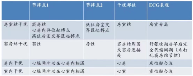 干扰性脱节现象(或干扰性分离现象):心脏两个频率接近的独立节律点产生的激动在同一组织中发生连续3次或以上的干扰现象。