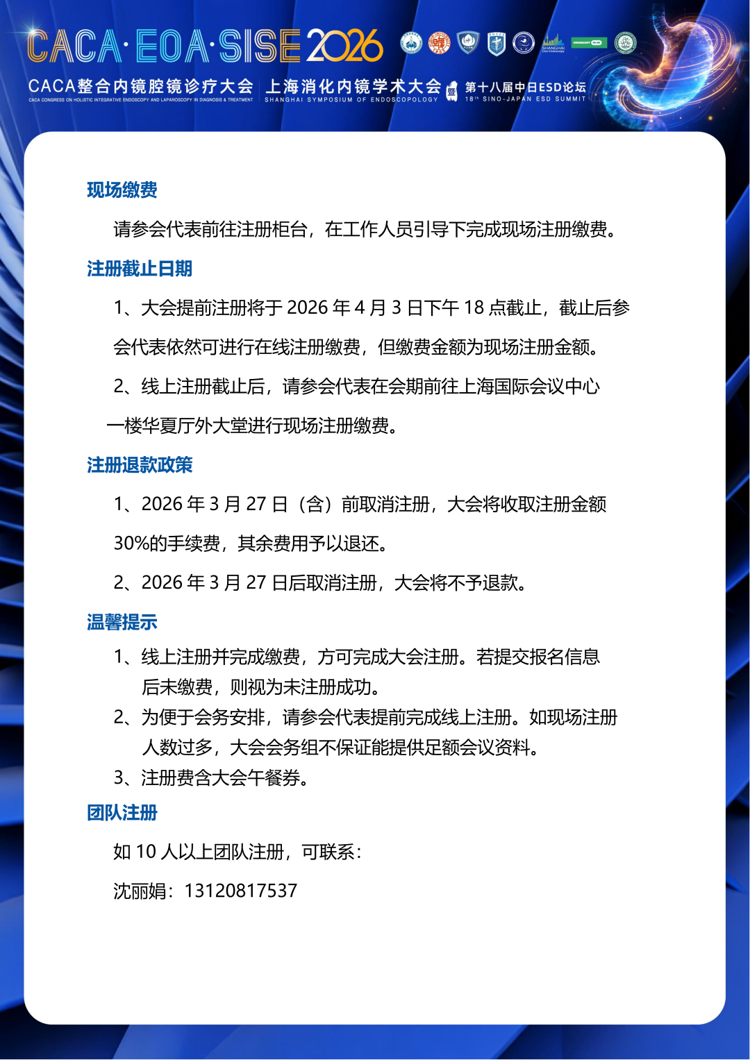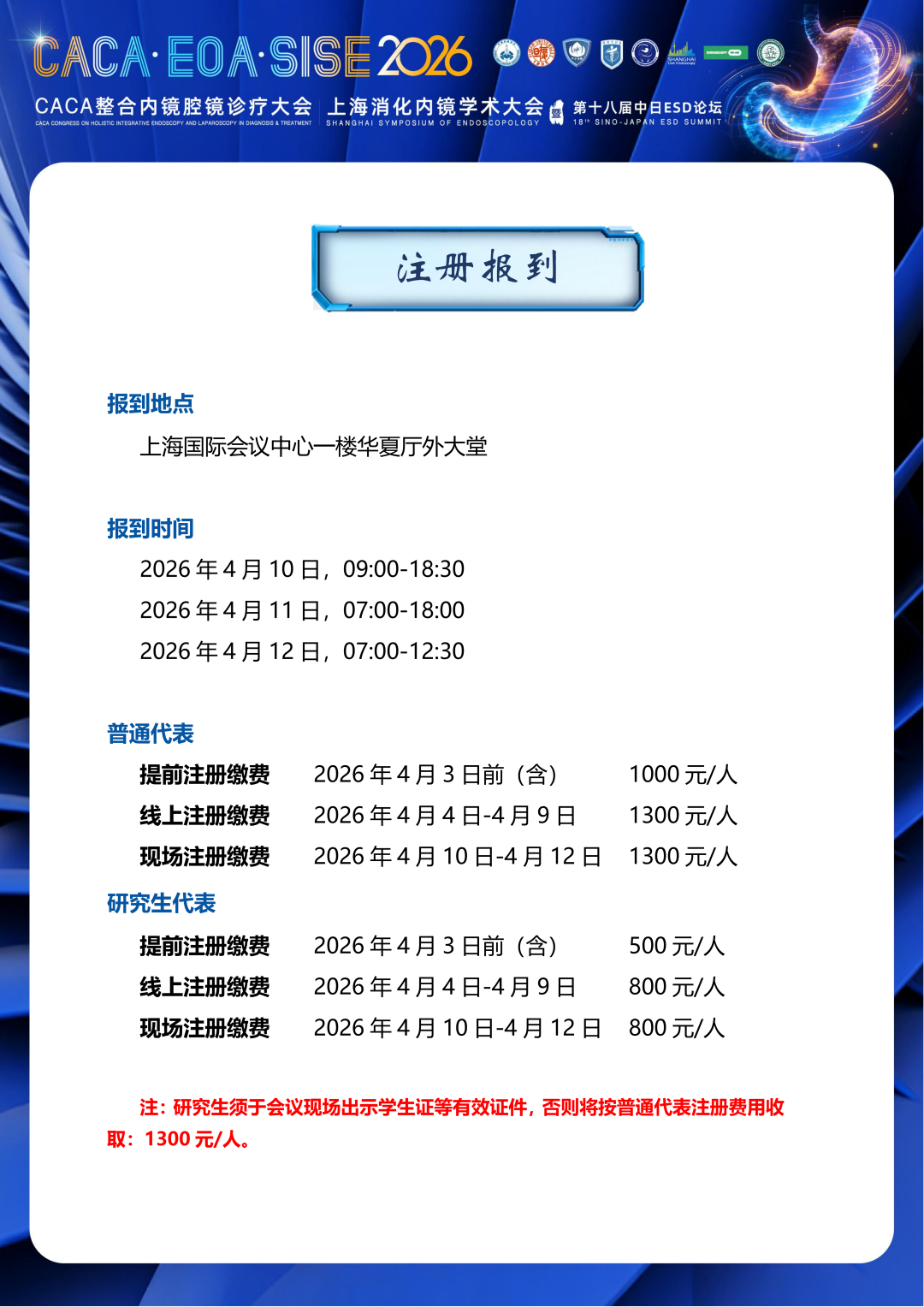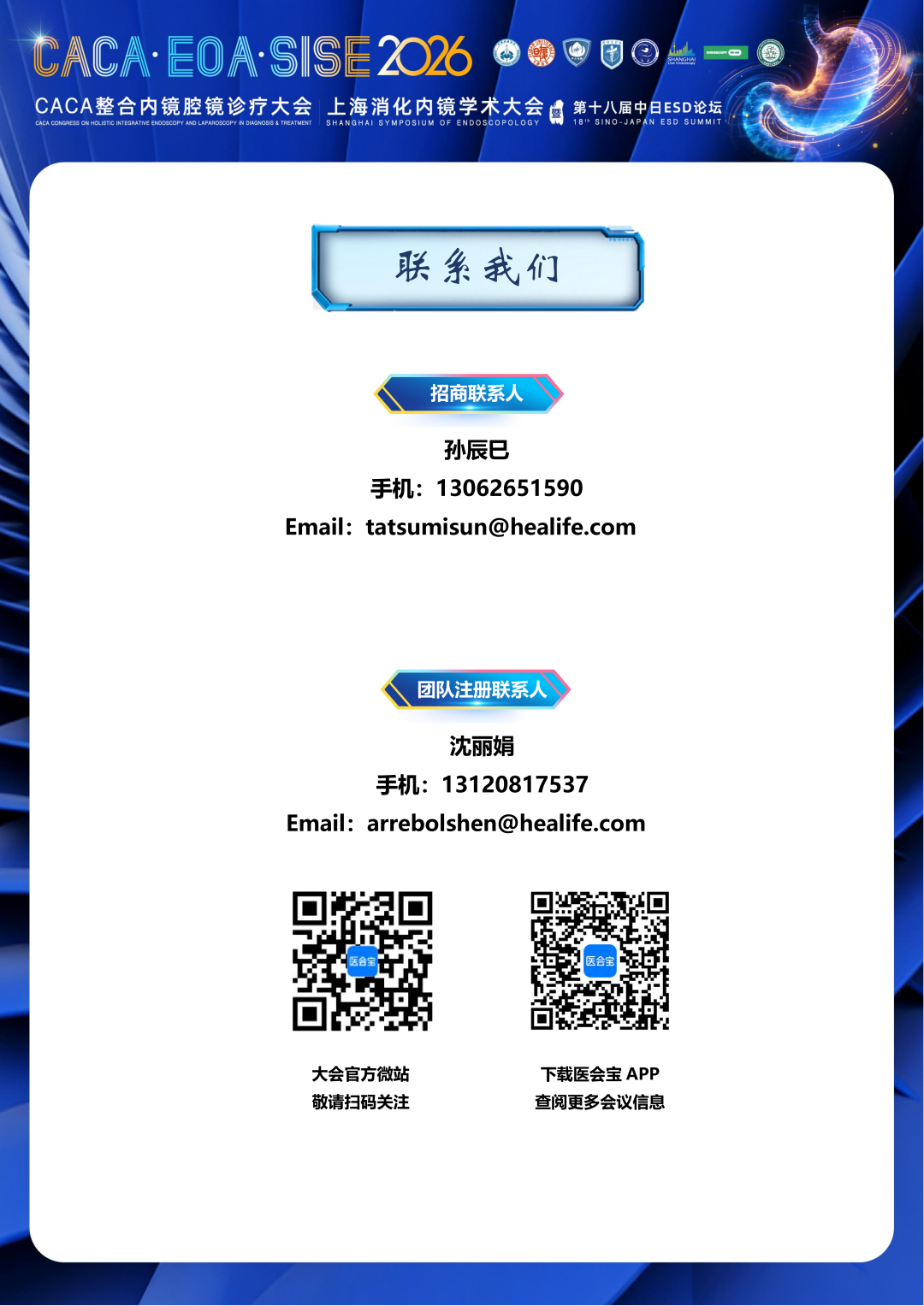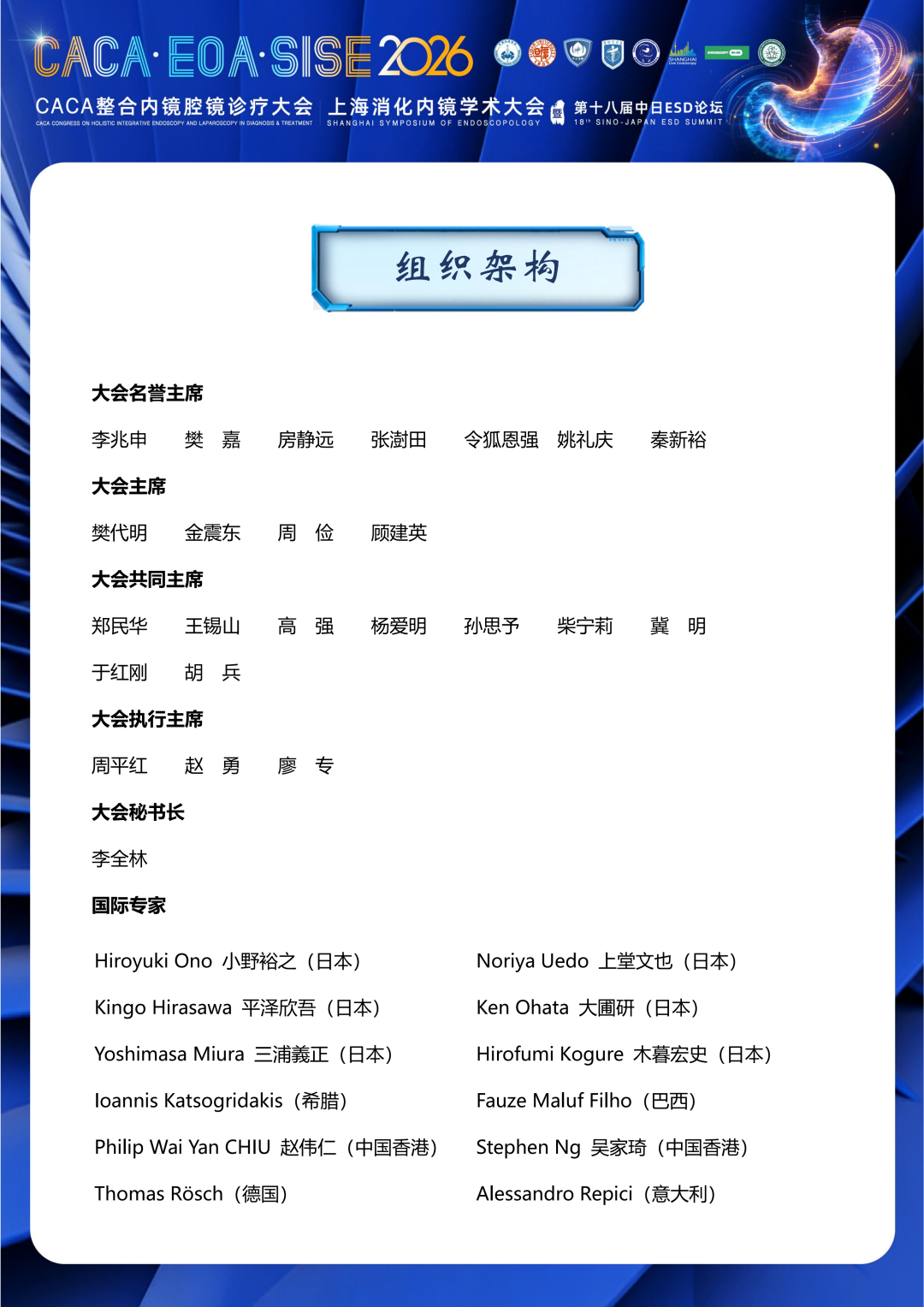 2026上海消化内镜学术大会暨第十八届中日ESD论坛将继续秉承历届会议以学术讲座和现场操作演示相结合的特点,并首次与中国抗癌协会整合内镜腔镜诊疗委员会等联合举办2026CACA整合内镜腔镜诊疗大会,两大盛会同期同地召开,实现学科交叉融合的深度升级。本次大会以“智镜策马·共创新境”为主题,聚焦肿瘤整合内镜规范诊治、内镜技术创新突破、内镜设备研发与人工智能深化,邀请国内外顶尖专家到会,以消化内镜微创手术为核心,以创新技术为驱动,同时兼顾诊疗的规范化、个体化与科学性,致力为全球同道呈现一场兼具学术深度与临床实用性的视听盛宴。