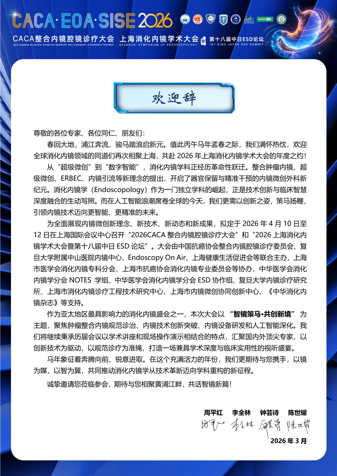 4月10—12日,诚邀您前来参会,期待与您相聚黄浦江畔、东方之滨。让我们以镜为媒,以智为翼,共同推动消化内镜学从技术革新迈向学科重构的新征程!